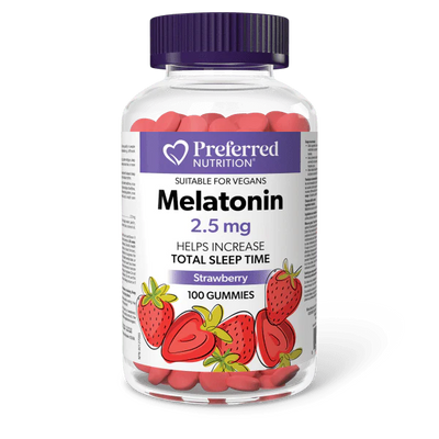 Preferred Nutrition Melatonin 2.5 mg helps restore the natural sleep-wake cycle for better, more restorative sleep. Melatonin can help reduce the time it takes to fall asleep, increase sleep quality and duration, and reduce jet lag. These vegan-friendly gummies are gelatin-free, non-GMO, and have a delicious strawberry flavour.