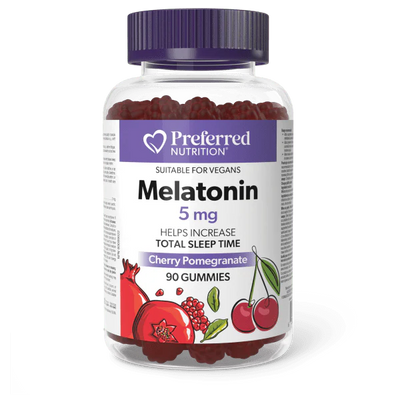 Preferred Nutrition Melatonin helps restore the natural sleep-wake cycle for better, more restorative sleep. Melatonin can help reduce the time it takes to fall asleep, increase sleep quality and duration, and reduce jet lag. This vegan-friendly gummy is gelatin-free, non-GMO, and has a delicious cherry pomegranate flavour.