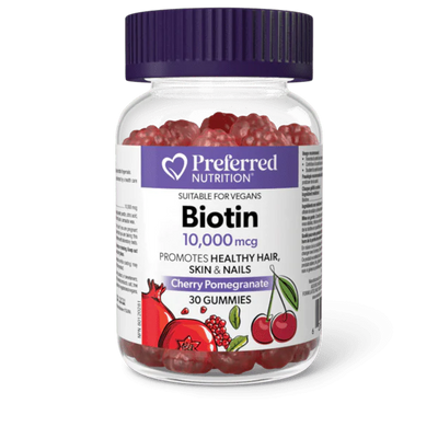 Preferred Nutrition Biotin is a hair, skin, and nail supplement delivered in delicious, cherry-pomegranate-flavoured, vegan gummies. Biotin is an essential B vitamin that helps strengthen hair, prevent splitting and brittle fingernails, and maintain healthy skin. Just one gelatin-free gummy per day provides 10,000?mcg of biotin to help prevent biotin deficiency.